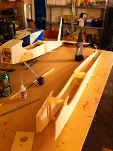 I've been building a new plane for a couple of weeks now. Every Tuesday I go visit one of my friends and while he is working on a very large seaplane I'm building a small aerobatic one. I've been flying an ElectroStik for the last two years and I like it alot but I've decided to try to build a FunAir which is more maneuverable and can fly a lot slower.